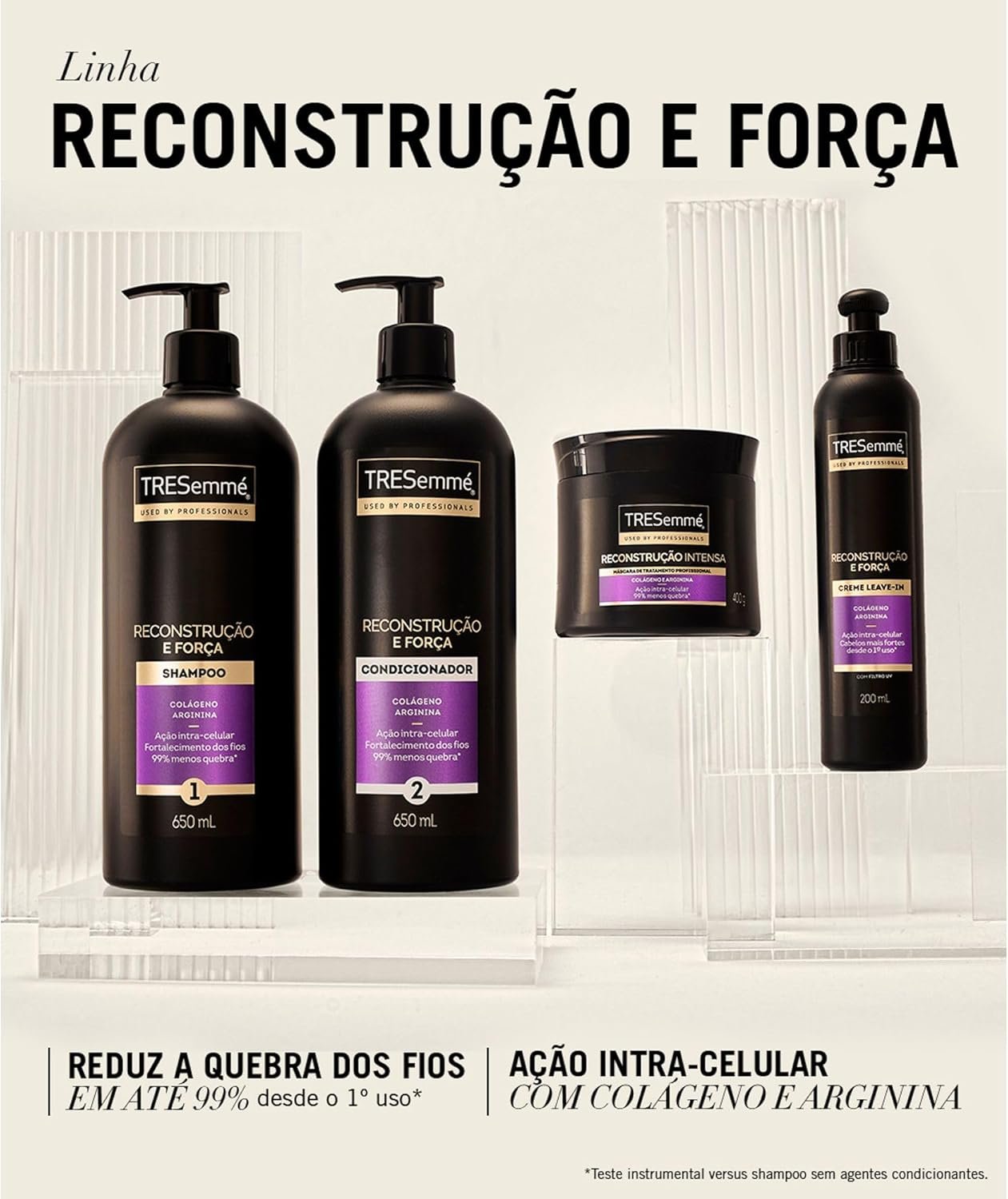 • Redução de quebra desde o primeiro uso: com o uso do Shampoo e Condicionador TRESemmé Reconstrução e Força, seus cabelos estarão mais resistentes, com uma redução de quebra de até 99%